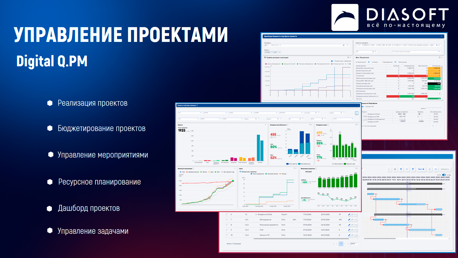 Digital Q.PM — решение компании «Диасофт» для управления проектами в любой отрасли бизнеса. Это универсальное решение является российской альтернативой таким популярным зарубежным программам, как MS Project, Asana, Jira, Trello. Digital Q.PM полностью адаптирована к специфике отечественного рынка и подойдет для средних и крупных предприятий.