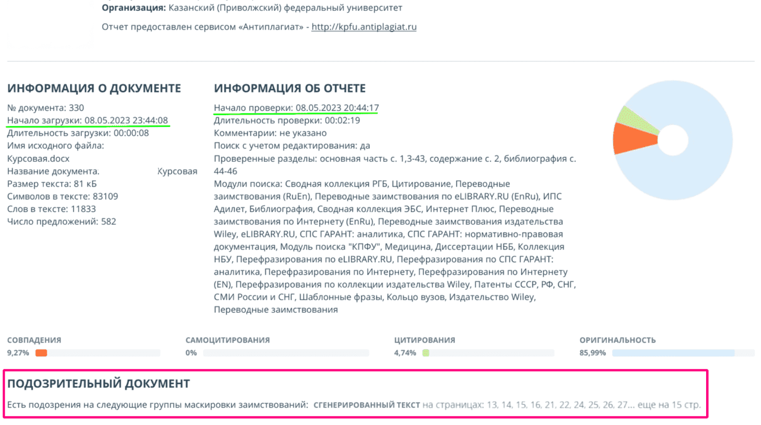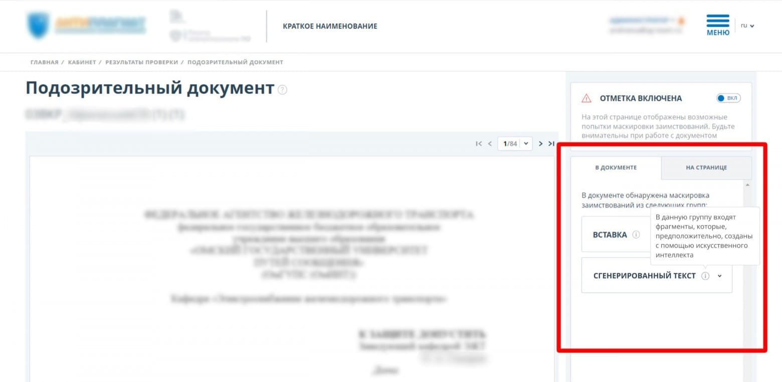 В большинстве случаев количество сгенерированного текста в самостоятельно написанных студентами работах не превышает 3%. Однако в данном случае нельзя сказать, что работа была полностью сгенерирована нейросетью, — студент основательно поработал над текстом и отредактировал его. Но все равно это не помогло, и система определила на каких страницах такой текст.