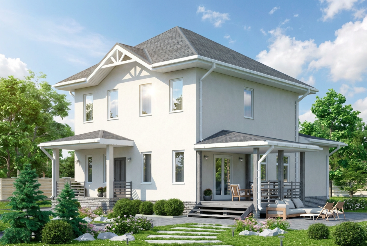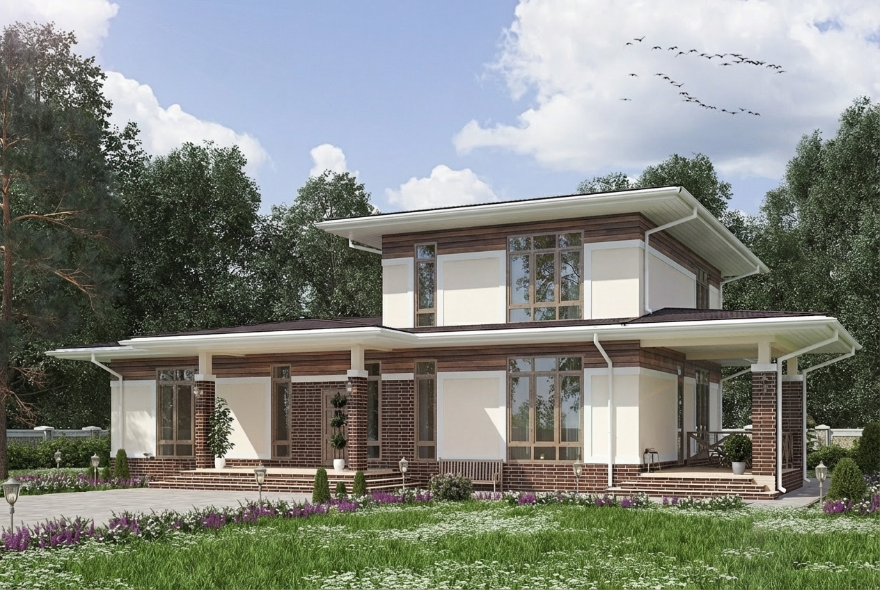 В двухэтажном доме – крыша у террасы, при ее наличии, обычно имеет с домом общий стиль.